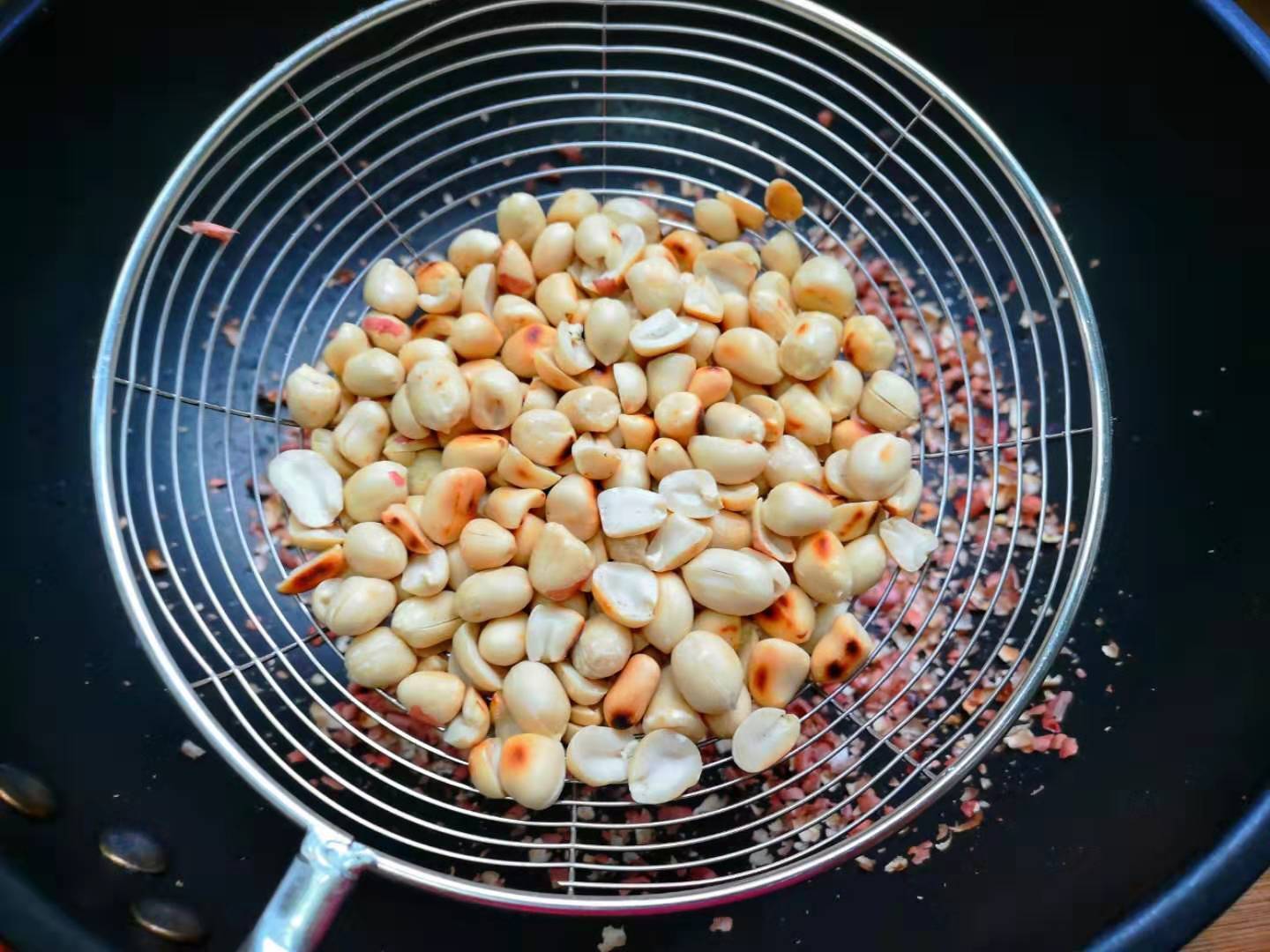 2、炒锅不放油,放入洗好的花生米小火慢炒5分钟,炒熟,放凉去皮,用漏勺筛掉花生皮。