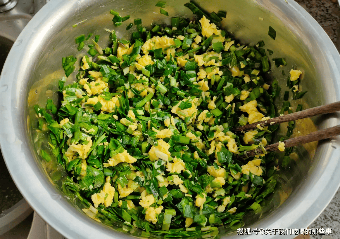 第二点:调馅料时,不要太早切韭菜,也不要太早放盐,因为韭菜很容易出水。记得要等鸡蛋炒好凉下来了,并且面团醒好了,再切韭菜。还有韭菜切好,应立即加油,锁住水分,避免出水。