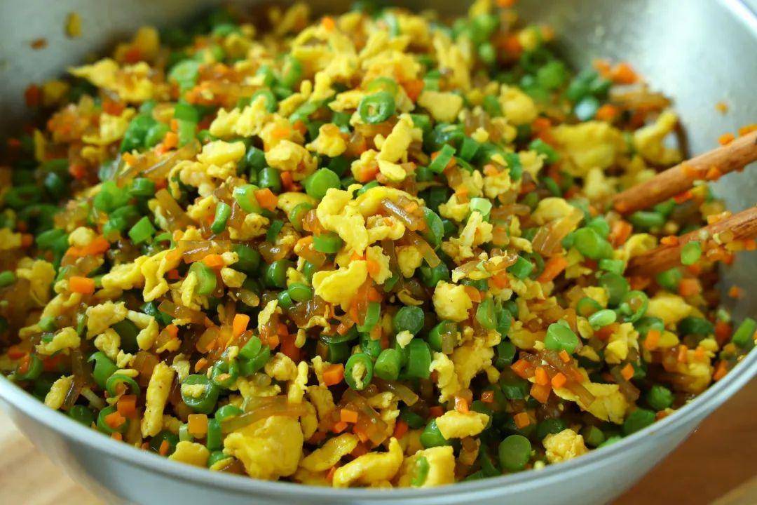 2、接下来,我们准备馅料。打散几个鸡蛋,在热油中迅速翻炒至金黄蓬松,盛出放凉备用。胡萝卜洗净去皮,切成细小的丁状,利用炒鸡蛋的余油,继续翻炒胡萝卜丁至其变软,这样不仅能提升胡萝卜的口感,还能更好地释放出其丰富的营养与甘甜。同时,将粉条提前煮软,切成小段,加入少许食用油和老抽拌匀,既防止粘连又增添了诱人的色泽。
