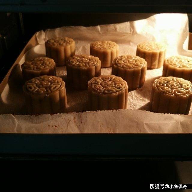 6. 烘烤 :预热烤箱至180℃,将成型的月饼排放在烤盘上,刷一层蛋黄液(蛋黄+少许水调匀),放入烤箱中层,上下火烤制约15分钟即可。期间注意观察表面上色情况,适时调整温度避免焦糊。