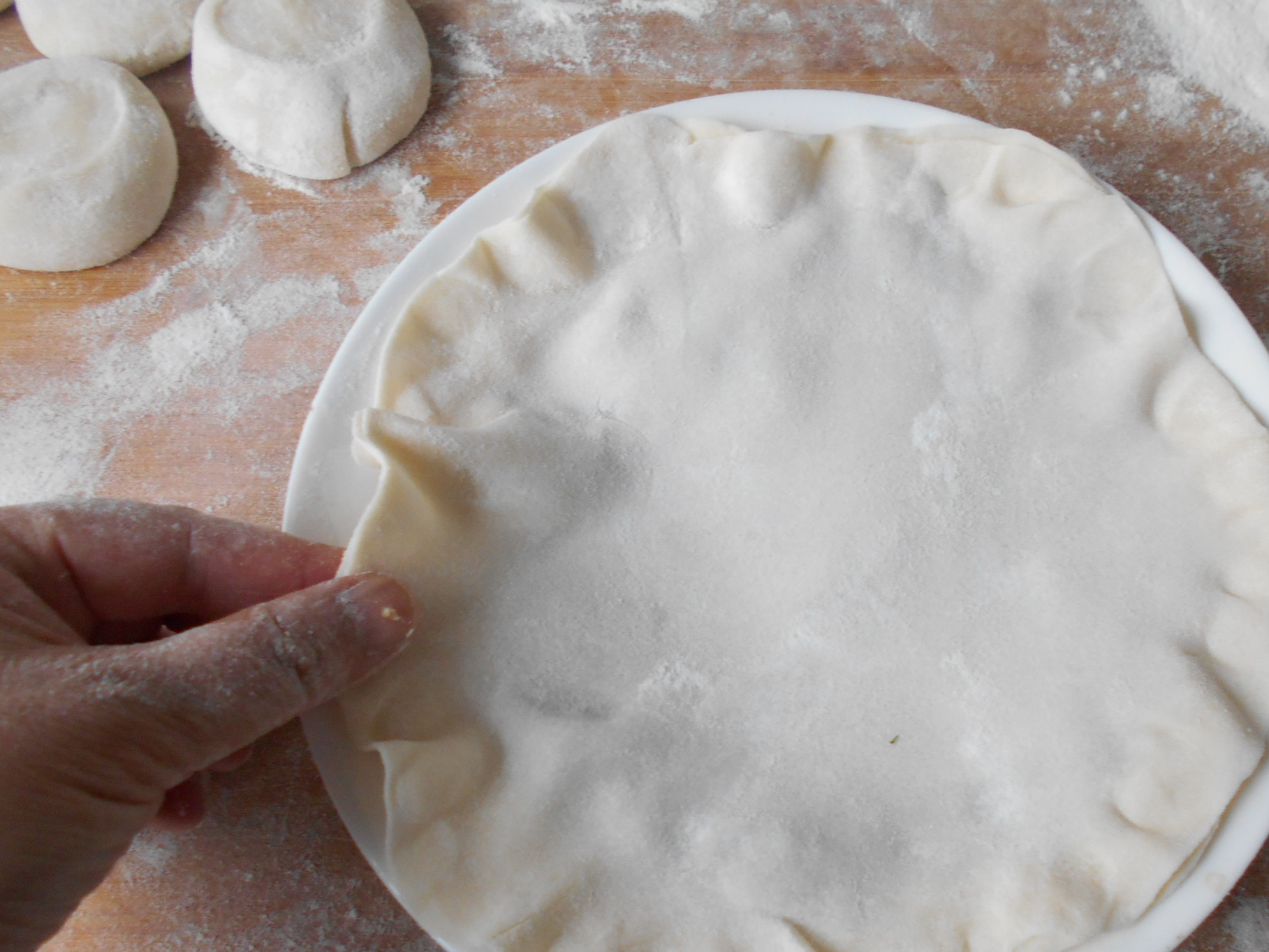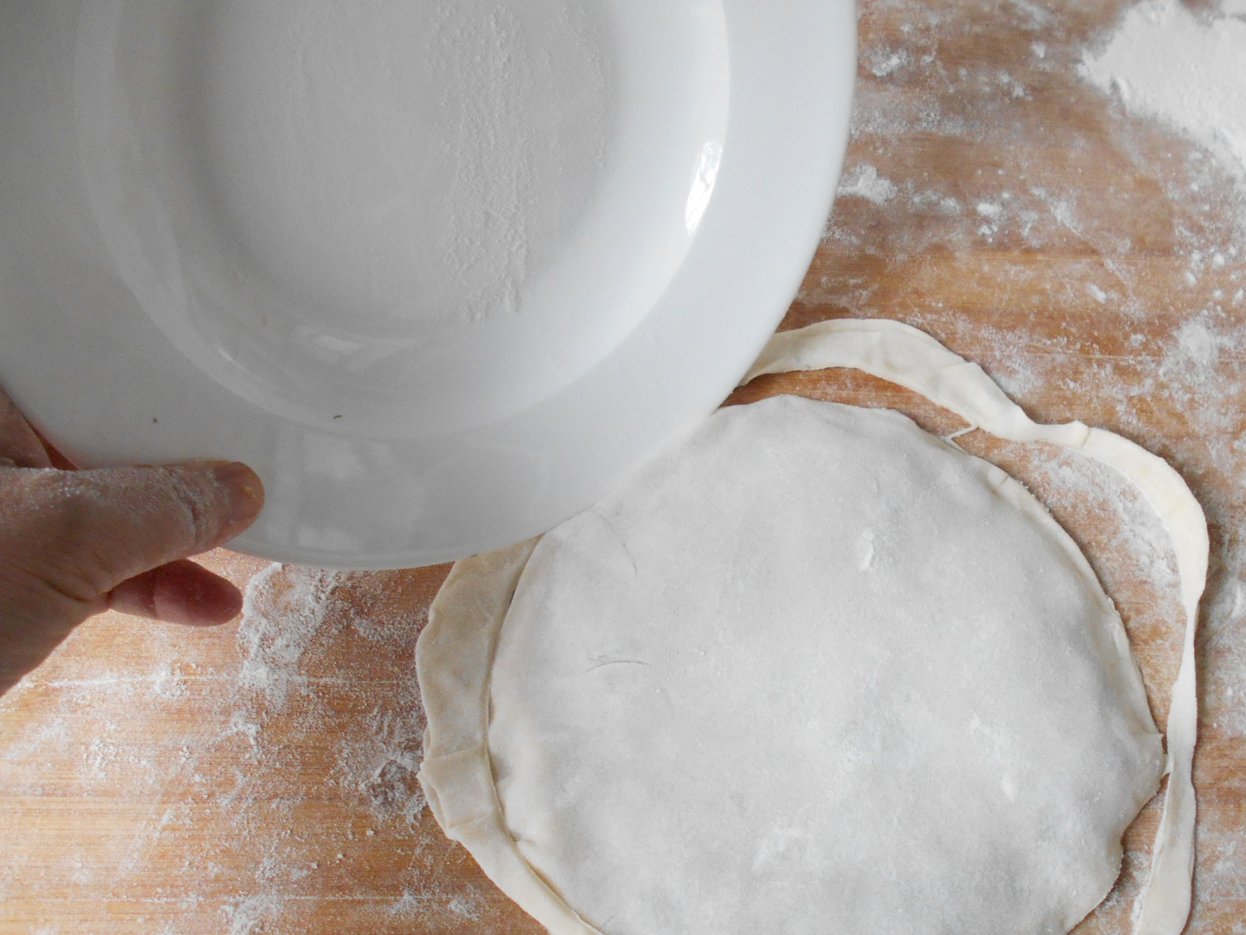 14捏的边缘大点没关系,我们可以把盘子竖起来,沿里圈略用力转一圈,紧贴着肉菜馅。这样压出的边缘更紧,且没有一点多余的面皮。