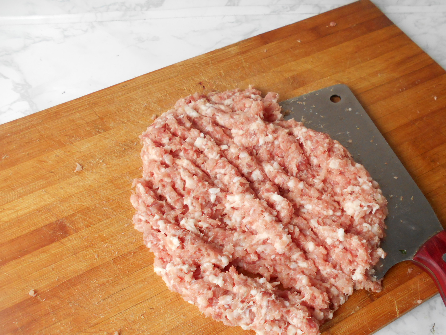 5肉用刀剁成肉馅,我们也可以直接买肉馅,注意二八或三七肥的最好,因为茴香喜油,所以肥一点的肉更香。