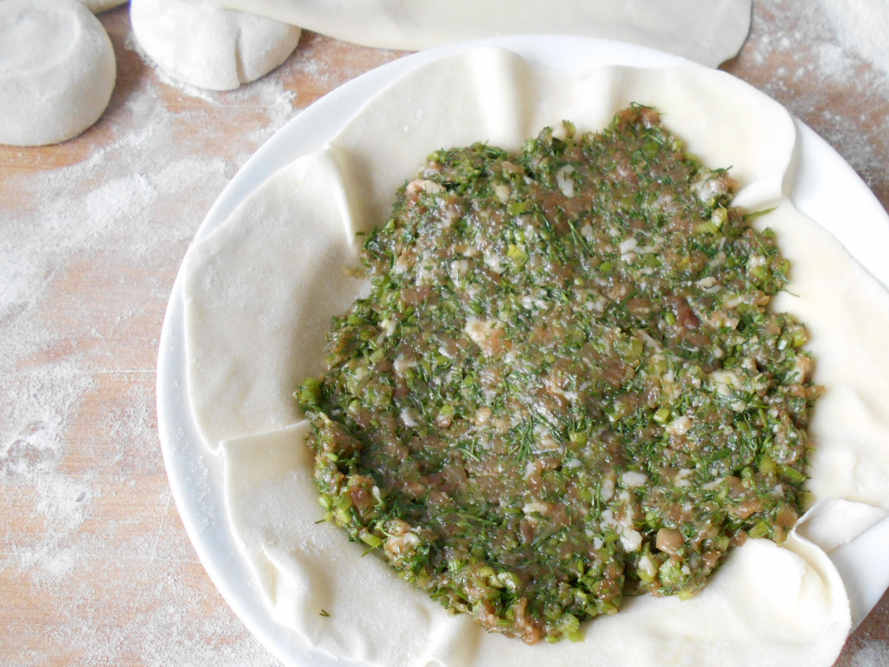 12放入调好的茴香肉馅。肉馅可以压实一点。