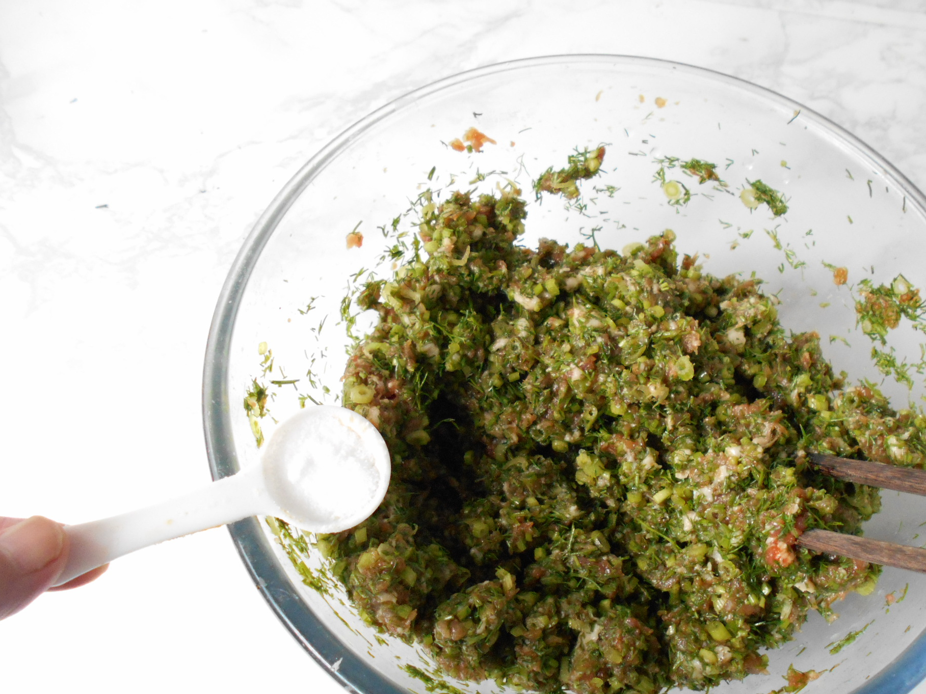 7茴香切成细末与肉馅放在一起加入食用油、盐拌匀备用。
