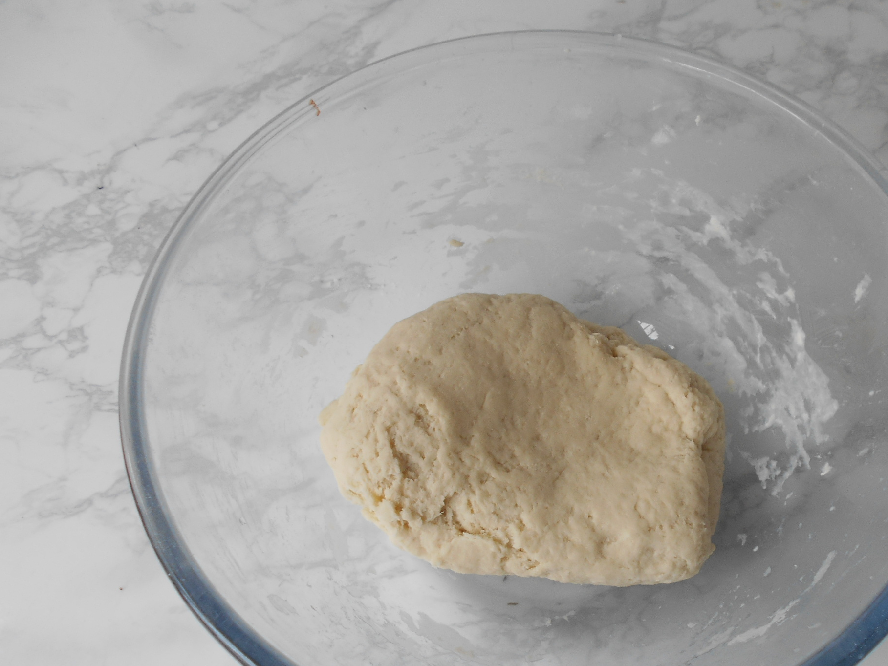 4用手沾着凉水把面揉成团,不光滑也没关系,只要没干粉就可以。放在一旁盖保鲜膜醒发半个小时左右或者更长时间。
