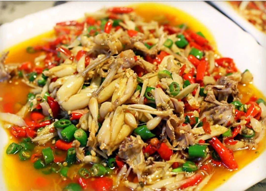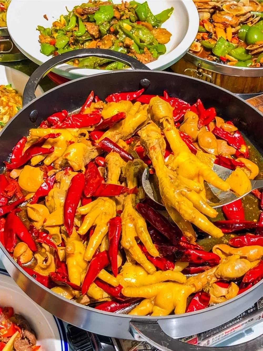 鸡爪稀溜耙, 稀溜耙是四川话,形容软糯可口,菜品里面是整根超大的鸡爪,带着二荆条辣椒的爆炒,吃起来麻辣入味,鸡爪咀嚼起来胶质感十足。