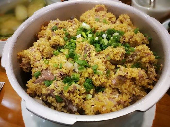 高压小米排骨, 本地朋友说乐山的美食不光是麻辣的,也有小清新的菜,这道就是,猪排骨炸好和上小米,山药一起高压锅蒸,入口都是小米的香,排骨的肉香味。