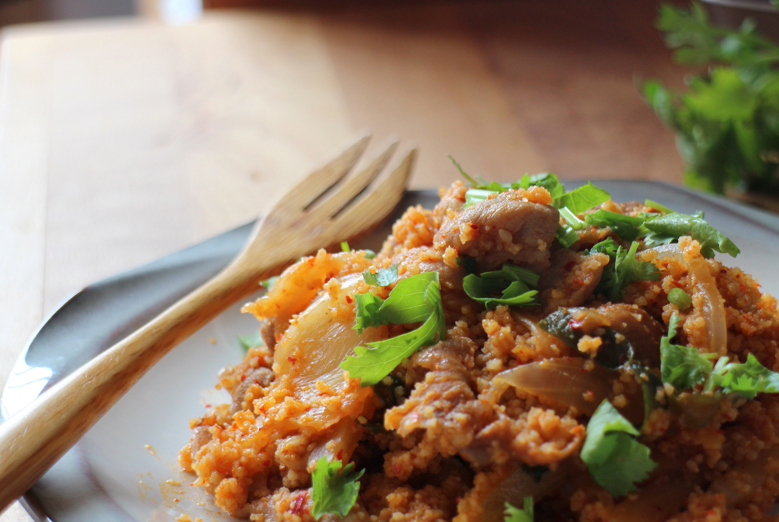 库司库司本身没有味道,好适合加在重口味的料理里,吸饱泡菜汁液的古斯米又香又辣,嚼起来有明显的颗粒感,这次的泡菜里有虾酱和鱼露调味,所以吃起来竟有像明太子的错觉,真的好妙,即便辣得嘴唇发麻,还是忍不住一口接一口!