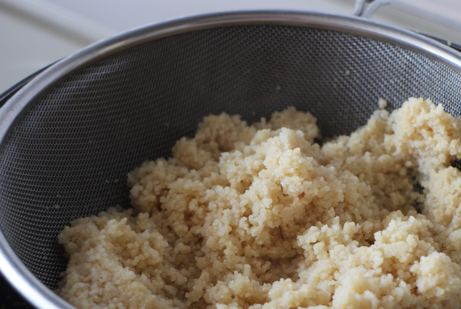 库司库司(北非小米)真是个方便的食材,有点像即食面,热水泡个几分钟就能吃~热水里加少许盐和橄榄油,煮滚后倒入库司库司稍微拌一下,加盖闷5分钟,然后滤掉水分,若手边有高汤时,我会省略掉盐和橄榄油,吸收的高汤的库司库司更是美味!