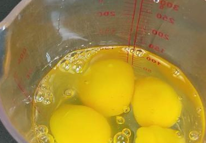 第4部,我们另外拿出一个干净的容器在里面打入4个鸡蛋,用筷子搅拌均匀。