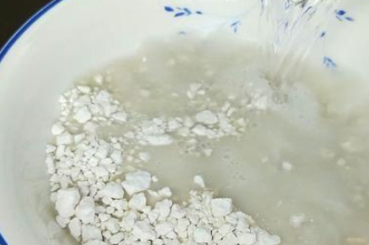 第1步我们在盆子里面放入150克的淀粉,因为有的淀粉里面会有颗粒比较大的情况,所以我们要加入400毫升的水,用筷子把它搅开,里面不能有任何的疙瘩。