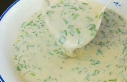 首先我们把食材准备一下。红薯淀粉150克,面粉150克,凉水400毫升,盐1勺,麻辣鲜1勺,胡椒粉1勺,油30毫升,韭菜碎半碗,鸡蛋5个