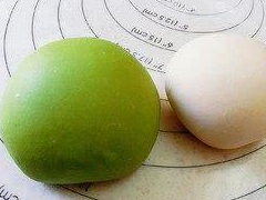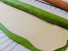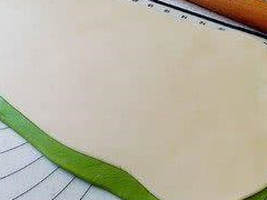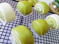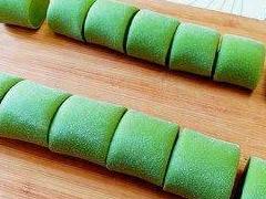 原材料:牛奶65克、糖15克、酵母1.7克、普通面粉170克、纯菠菜汁85克、普通面粉130克、白色面团、绿色面团、酵母1.3克