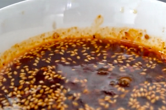 第四步:在小碗中放上一点蒜泥,淋上一点热油搅拌均匀,然后再加上一点辣椒油、香醋、凉白开搅拌均匀,再把面皮里面的水不要倒掉,夹起一片面皮,蘸着料汁即可食用。