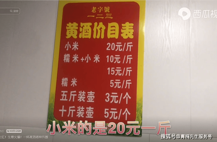 黄酒,主要以糯米、黍米(黄米、酒谷米)、大米、红曲、黑米、玉米、小麦、水等为主要原料,其中黍米型黄酒的营养价值最高,每斤价格在20元以上。