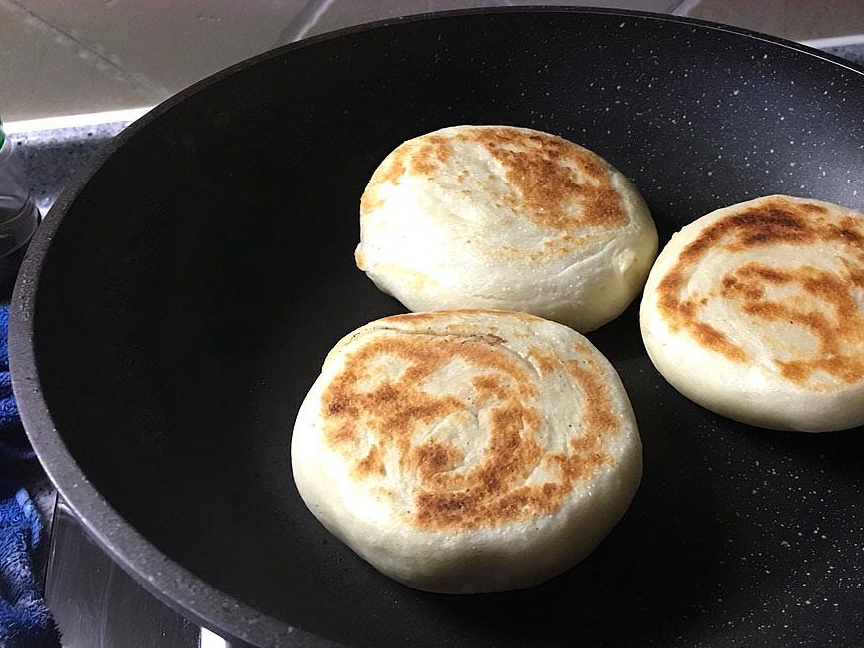 6、平底锅烧热,不放油,放入面饼,小火慢慢烙至两面都成金黄色,烙的时候最好盖上锅盖