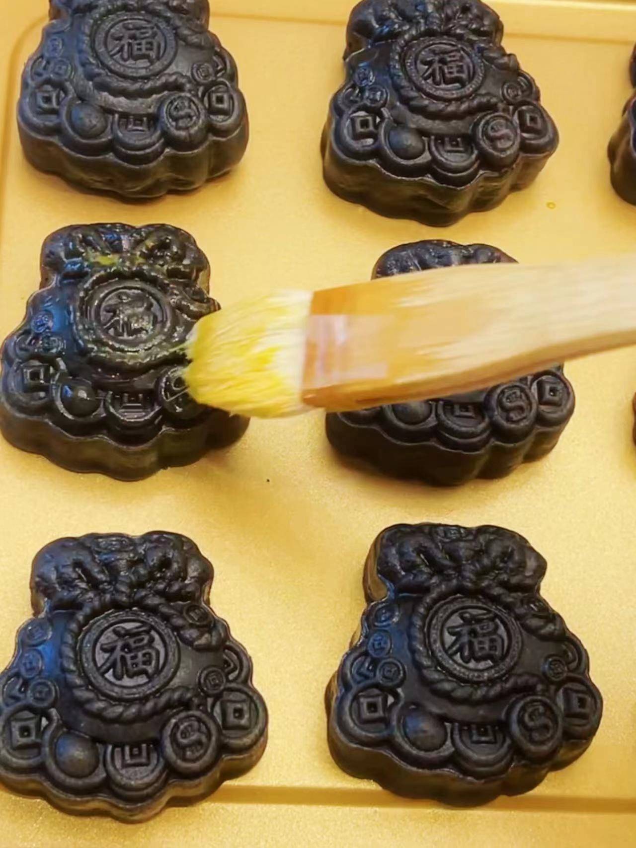 1.蛋黄水搅拌均匀后过筛一遍更细腻 用羊毛刷薄刷一层 刷太多容易花纹不清晰。
