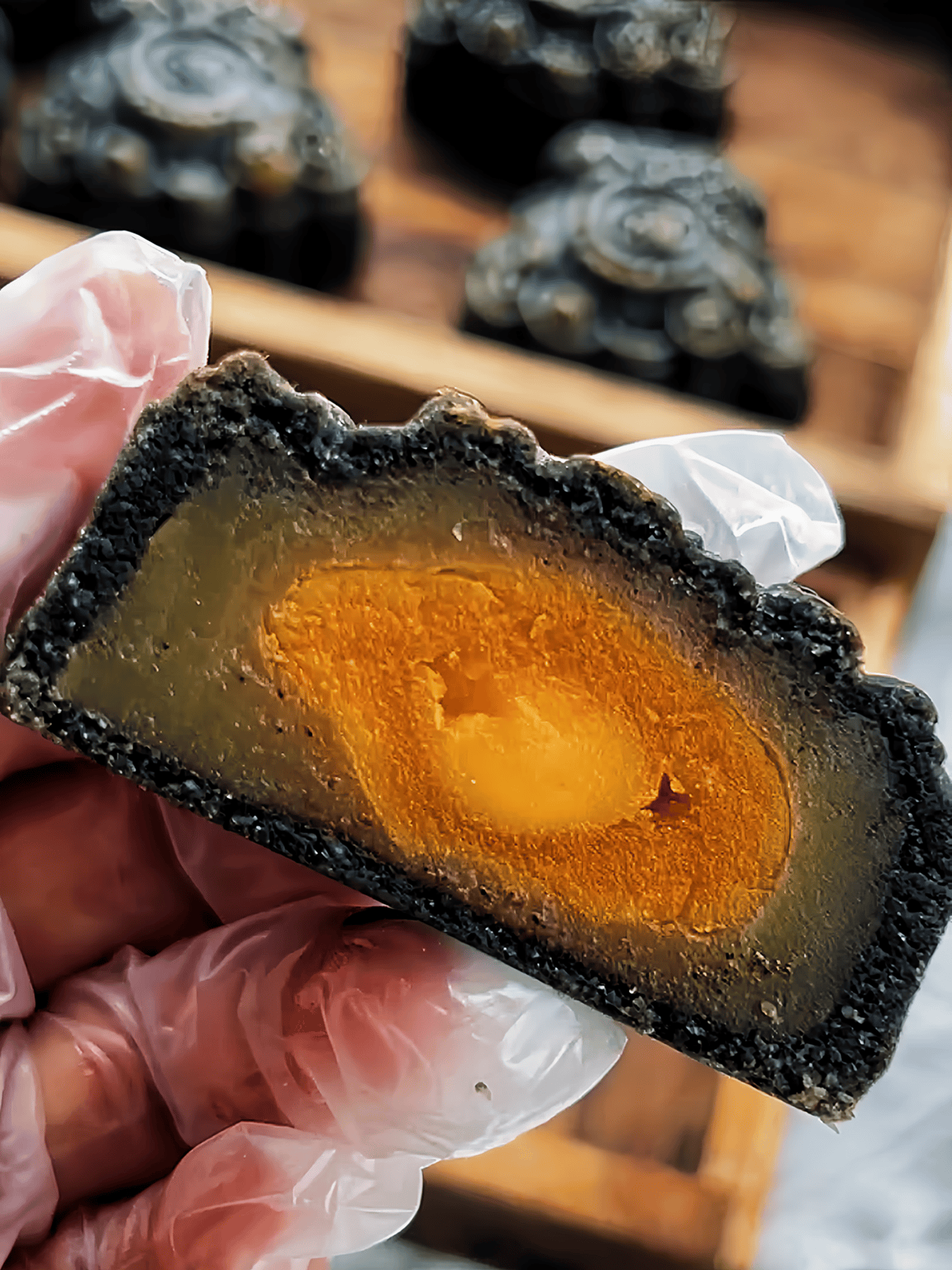 首先,让我们一同来揭开这款在网络上备受赞誉的黑金月饼那神秘的面纱。它绝非仅仅是传统概念中的月饼,倒更像是一款新颖的糕点,一件令人赏心悦目的美味艺术品。它身着神秘的黑色外衣,却包裹着璀璨金黄色的内心,散发着勾人魂魄的香气与迷人光泽。