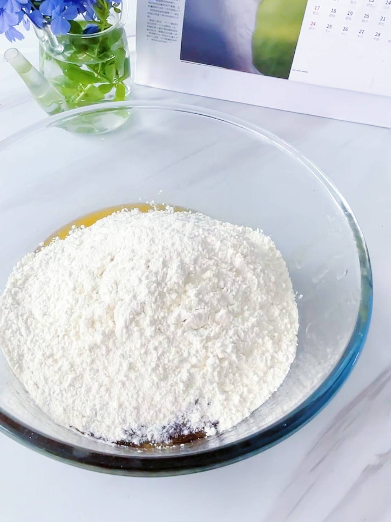 3.加入中筋面粉,戴上不粘手套抓取均匀。