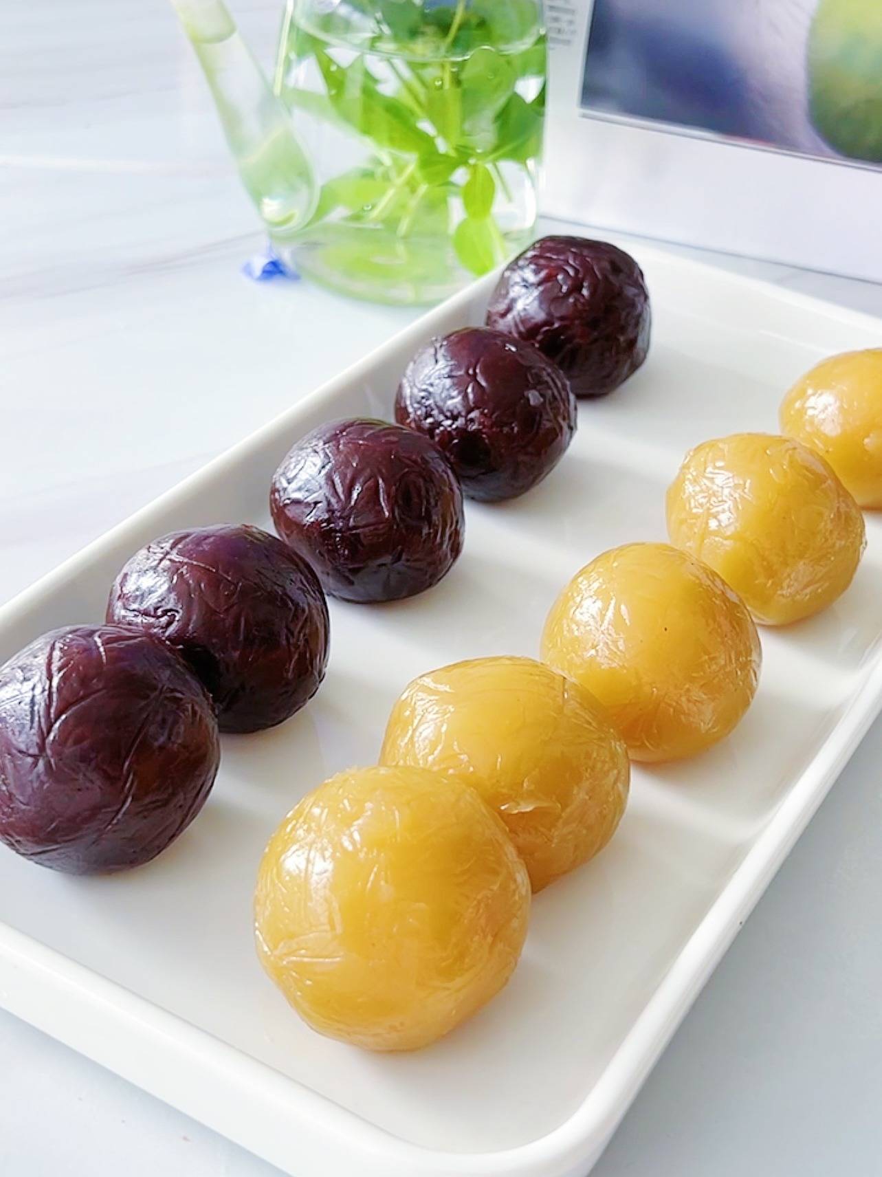 转化糖浆 250g、黑米粉 223g、中筋面粉 220g、枧水 10g、花生油 92g、红豆沙适量、莲蓉馅适量、咸蛋黄 20 个。