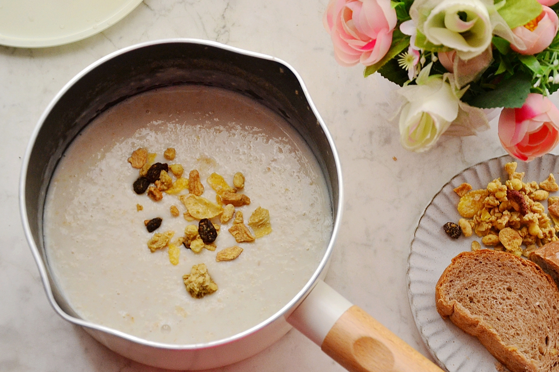 首先将牛奶直接倒入锅里面,小火煮开,然后将燕麦倒入继续煮几分钟,中间要用勺子不断翻动避免糊锅,最后吃的时候撒上什锦果干即可,天冷时候我们家喜欢这样的粥品然后搭配自己做的粗粮欧包,吃得舒服而且易消化。