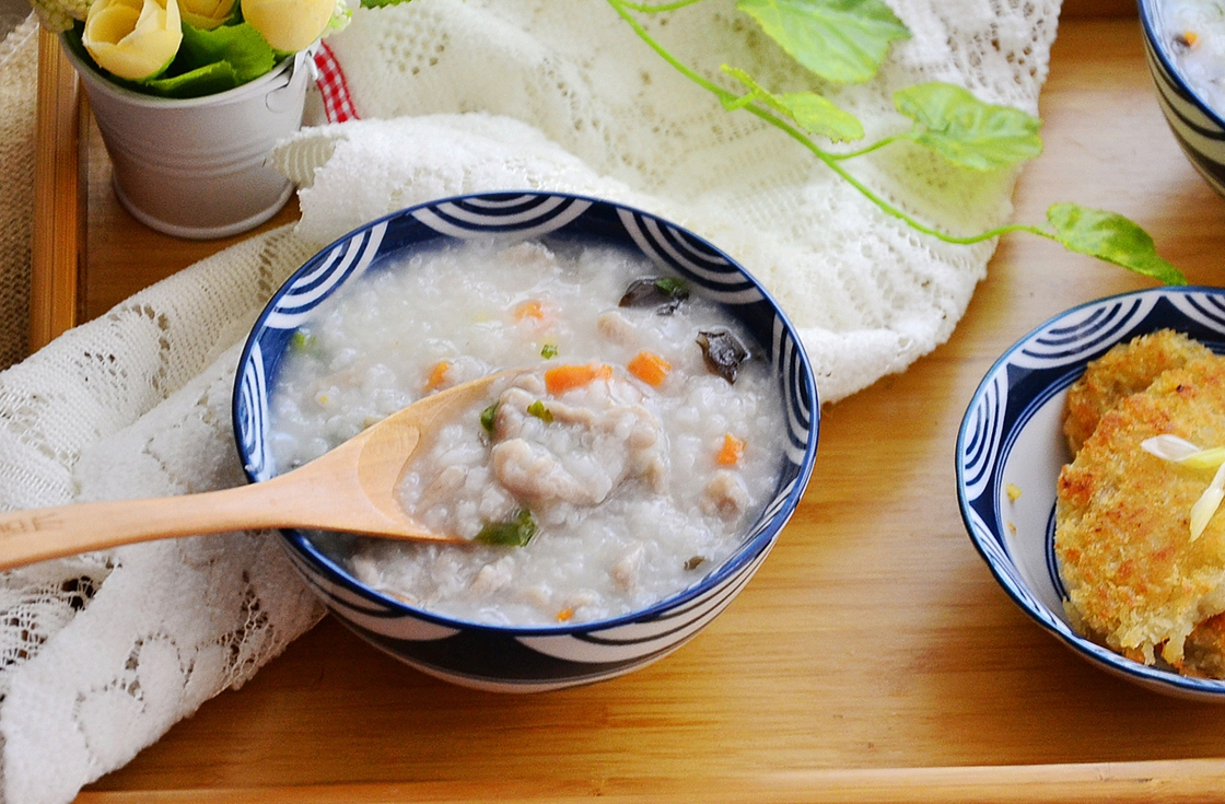 接着将米和水按照1:10比较熬煮,煮到微稠的状态,然后将香菇,胡萝卜和瘦肉丝一起放入,继续煮5分钟左右,最后放盐、胡椒粉调味就成。