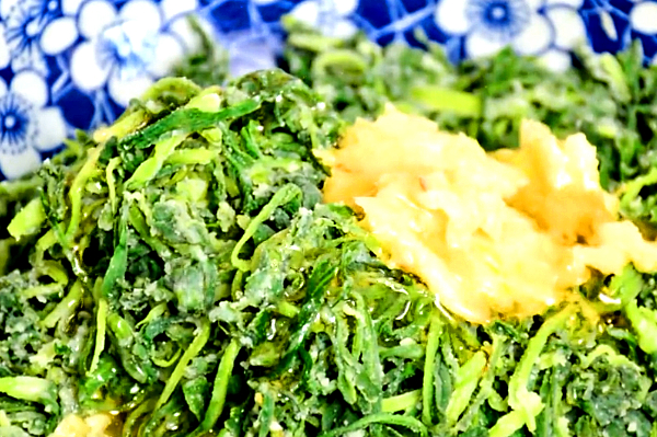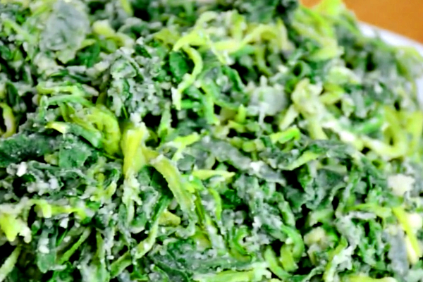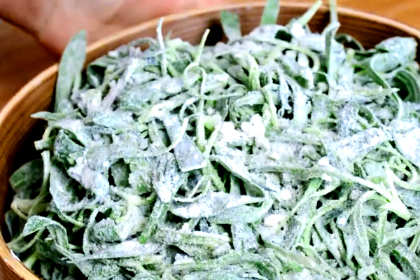 首先我们将面条菜的根部去掉,然后用清水洗干净,把面条菜放入菜筐内沥干水分,让它晾一个晚上,第二天将晾干的面条菜放入盆中,加入十毫升熟油,加油是为了让面条菜不出水,拌面粉的时候也不会粘在一起,然后加入干面粉,把面条菜用手拌匀,拌匀之后放入蒸笼,锅内水烧开后将蒸笼放入蒸锅,盖上盖子蒸五分钟,准备几颗大蒜,将蒜放到石臼中,加一勺盐,把大蒜砸碎,砸成蒜泥。