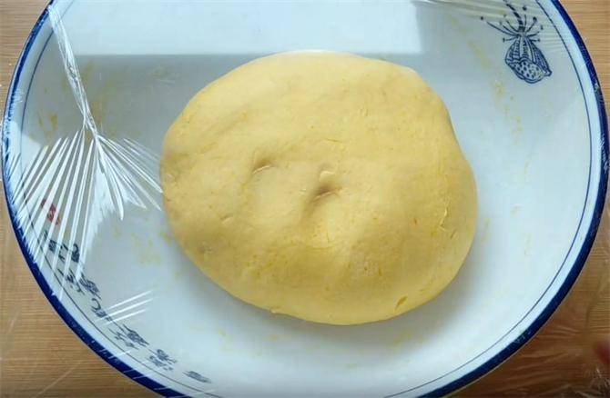2.准备约400到500克的面粉,边倒边搅拌,这个面粉的多少取决于南瓜的含水量,搅成面絮状,加入20毫升食用油,加油能够使做出的馒头表皮更加光滑,揉成稍硬一点的光滑面团,盖上保鲜膜醒发至两倍大,南瓜泥中含有糖分,面团会发酵的很快,大约40分钟就可以。