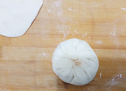 大家在做这一步的时候,就像包包子一样收好口。包好之后不用再擀了,放在电饼铛上,直接用手压一下就可以了。