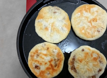 这个时候盖上盖子,把这个饼烙至两面金黄就可以了,大家在烙这个饼的时候,在中间可以打开锅盖翻面一次,这样子烙出来的饼会更加均匀,吃起来的味道会有好吃。