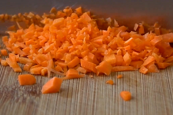 2:准备一根胡萝卜,把胡萝卜切成末放在豆腐泥中(注:切的越随碎越好)。