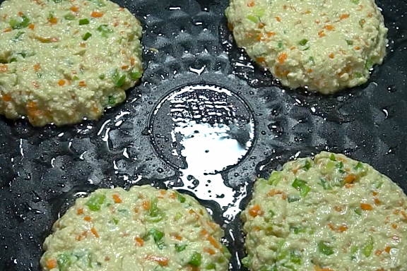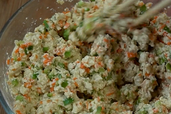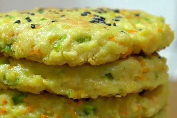 原材料:豆腐、鸡蛋、胡萝卜、菜椒、葱花、食盐、胡椒粉、食用油、面粉、芝麻。