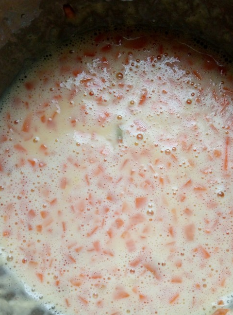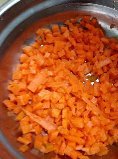 3.然后把切好的胡萝卜粒倒入拌好的鸡蛋里,加入适量的盐,继续搅拌一下