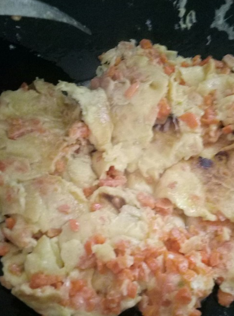 鸡蛋2个、面粉适量、胡萝卜一根、精盐适量、植物油适量、水适量