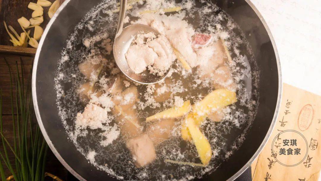 2、排骨洗净,冷水下锅,加入姜片和料酒,煮开,捞出沥干水分。