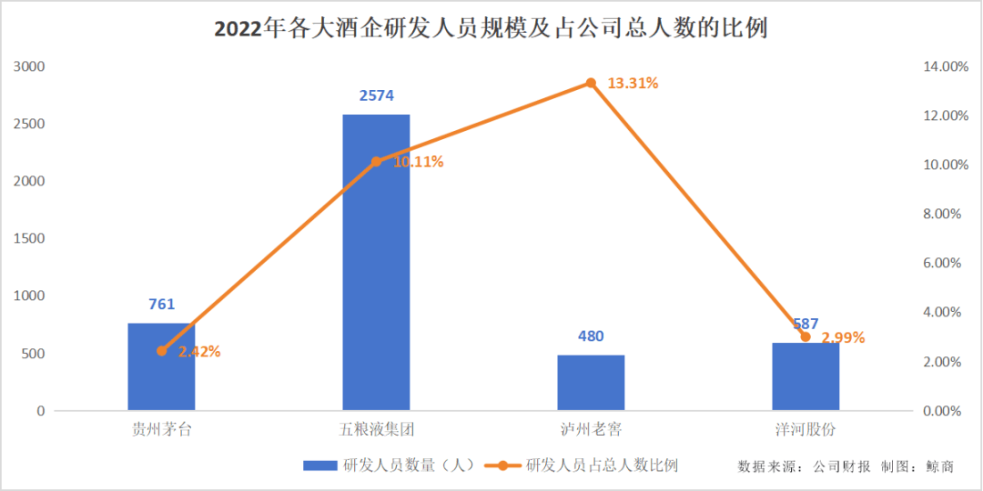 中国白酒的科技感也会随着研发的投入逐渐增强。 2022年五粮液的研发投入高达2.36亿元,并且还在高速增长,同比增速达到32.9%,研发人员的数量位列行业前茅。