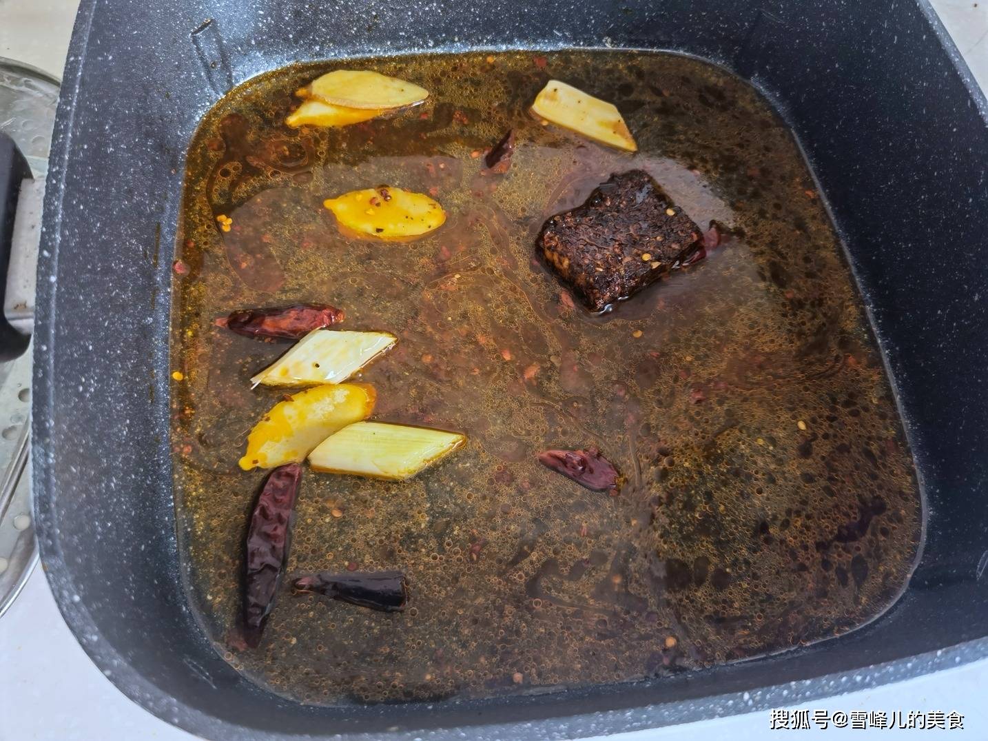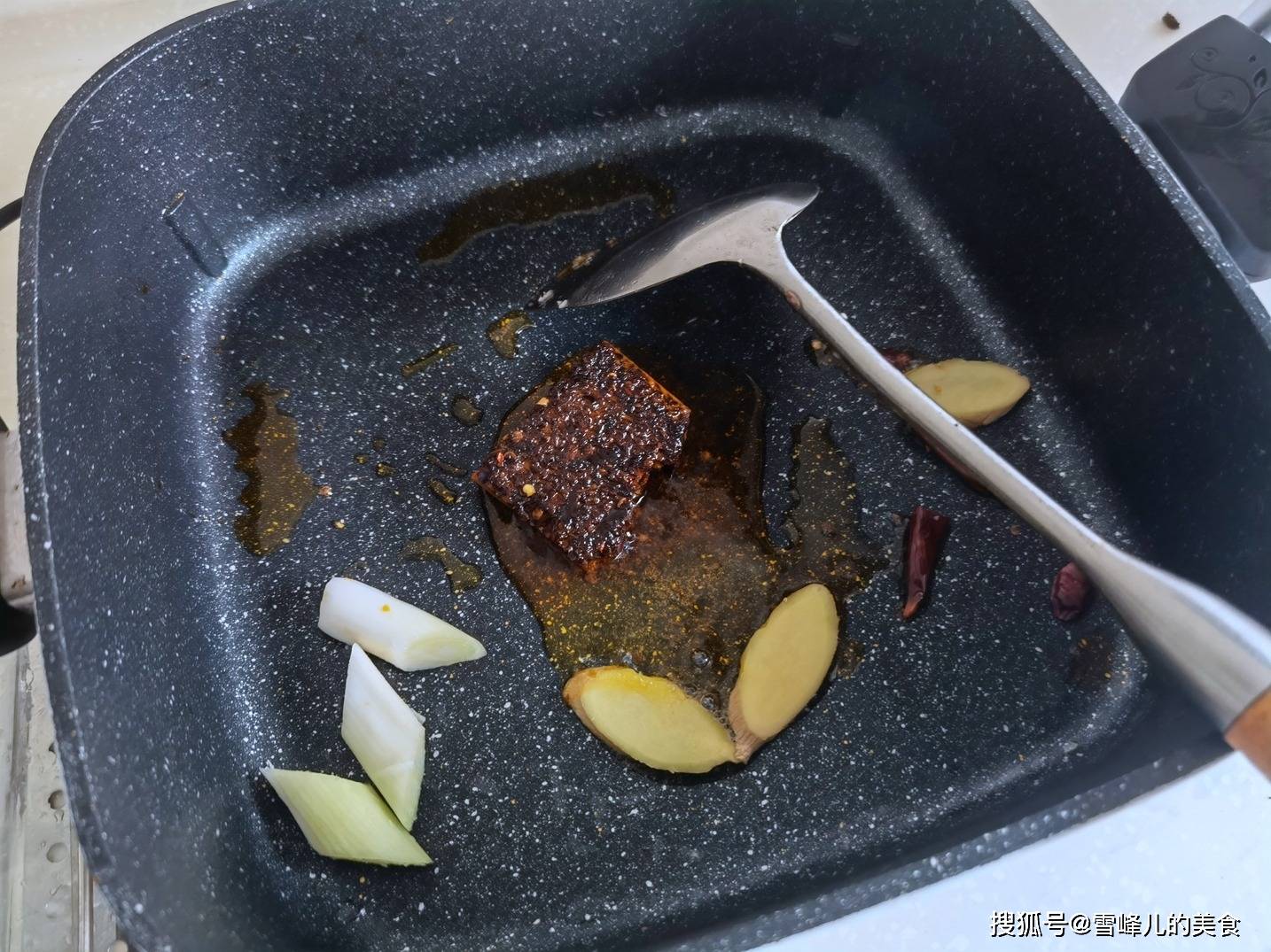 第三步:电锅梨放入麻辣底料,放入少许花生油,再放入葱姜炒香。