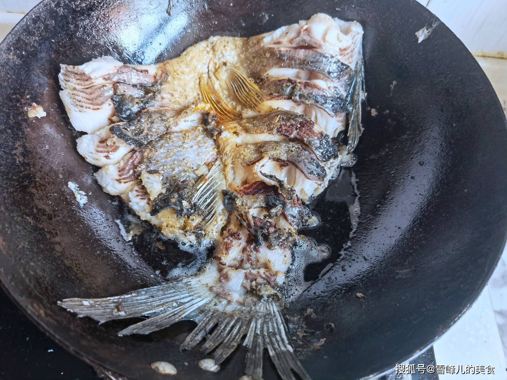 第二步:把铁锅烧热,放入花生油,把花鲢鱼尾放入铁锅内,中小火煎至两面金黄备用。