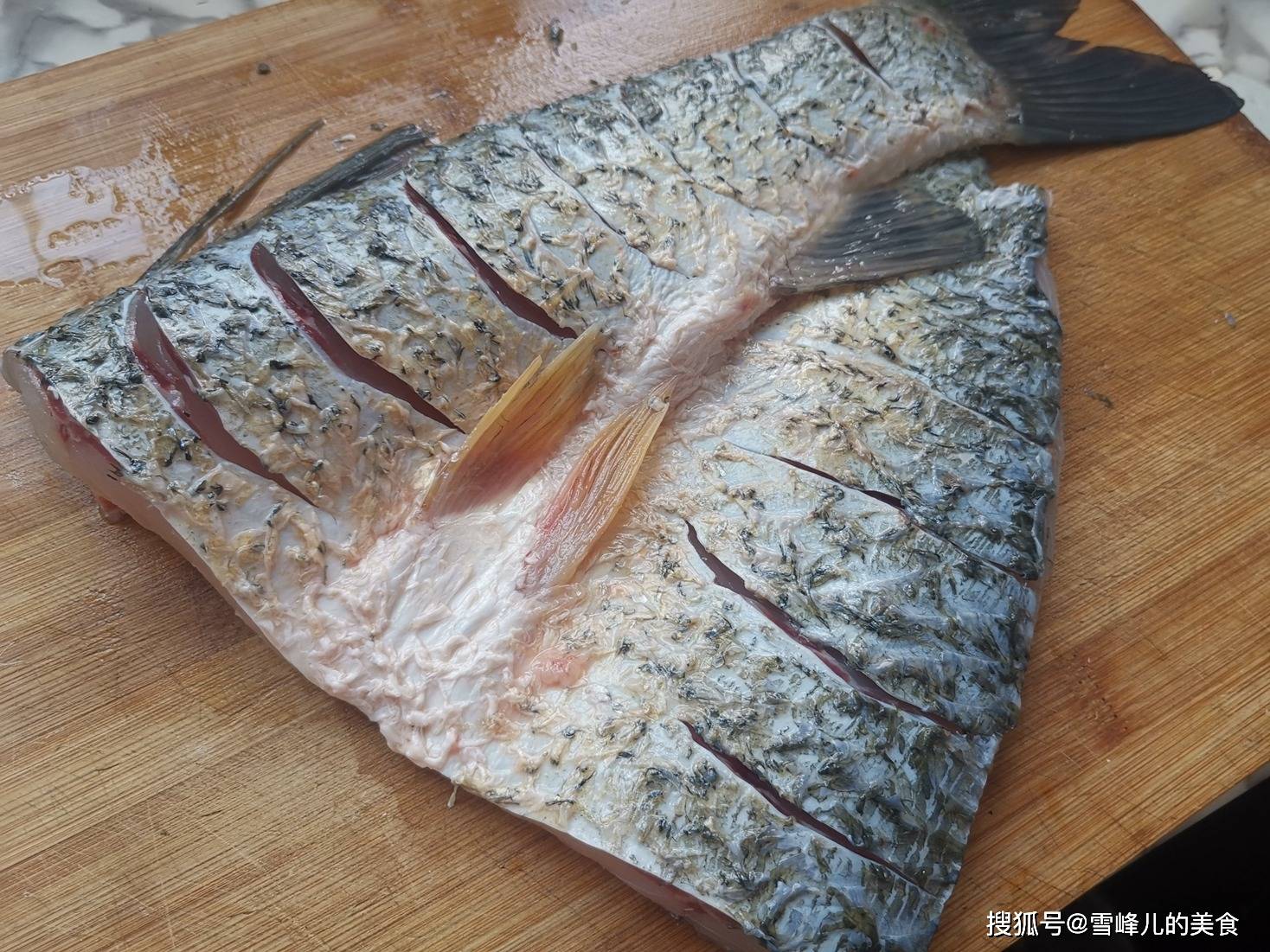 第一步:花鲢鱼尾从中间劈开备用,花鲢鱼一般这个季节都很肥美,个头也比较大,一拌都是3~4斤,也是最好吃的季节,一次吃不完可以分成两次做。花鲢鱼也被称为胖头鱼,鱼头可以做成剁椒鱼头非常棒。花鲢鱼虽然不贵,但是营养非常丰富,温补很不错,很适合冬季,可以健脑、暖胃、降低胆固醇等等,建议冬季要常吃!