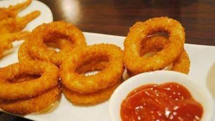 做法:将洋葱洗净,平放在案板上(头朝前,茎朝后),切成约0.5厘米厚的圆片,然后用手剥成洋葱圈。烹饪时也用同样的方法。让它变大或变小,以更漂亮的为准。将2汤匙低筋面粉、1个鸡蛋和1汤匙水混合均匀,然后分别准备面包粉和低筋面粉,放在2个平板上备用。先将洋葱圈沾上面粉,轻轻拍去多余的部分,然后沾上面糊,最后沾上面包粉,轻轻压紧,然后将所有洋葱圈一一成型。
