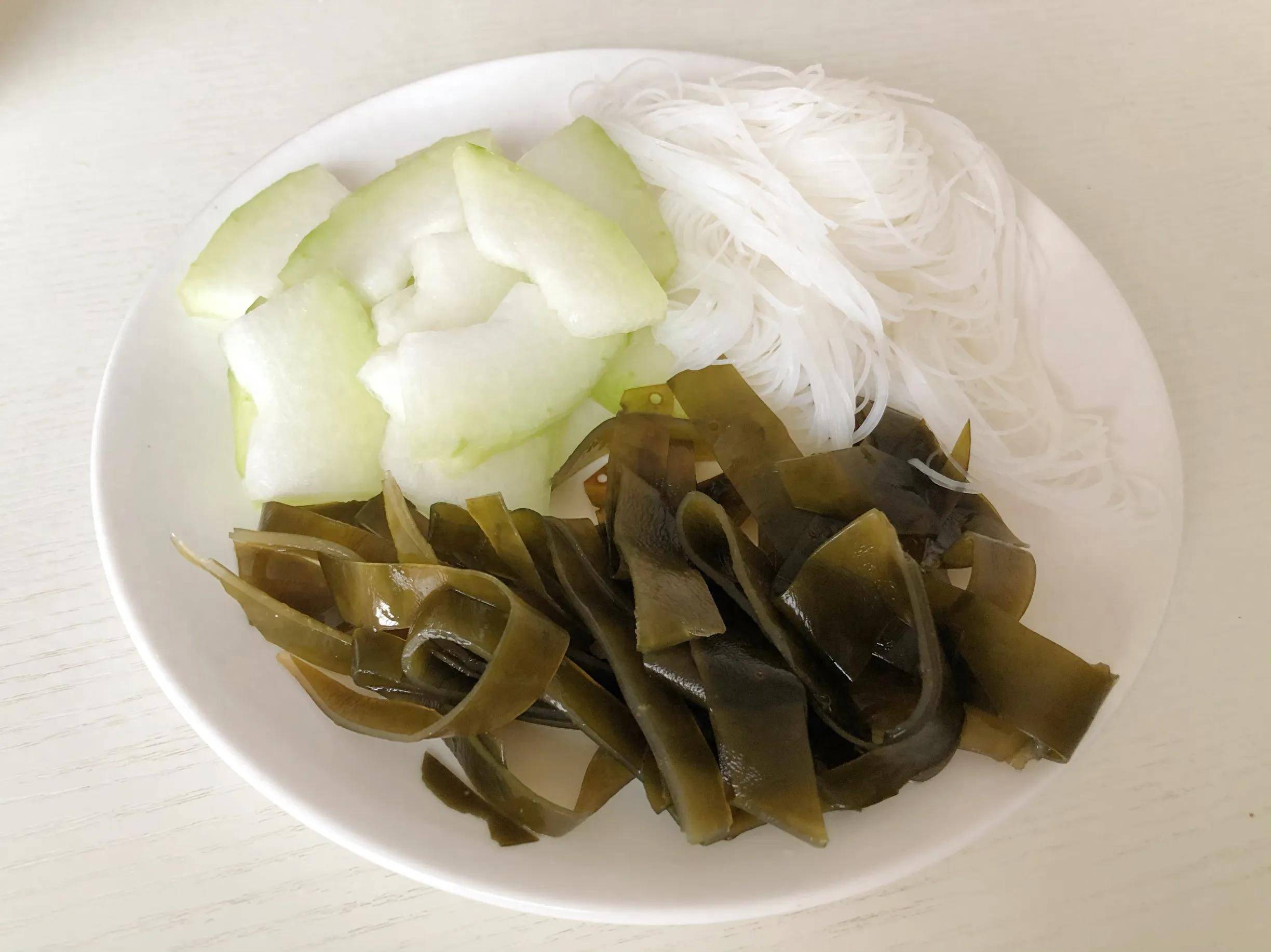 (2)粉丝泡软,冬瓜和海带处理干净,切成小块