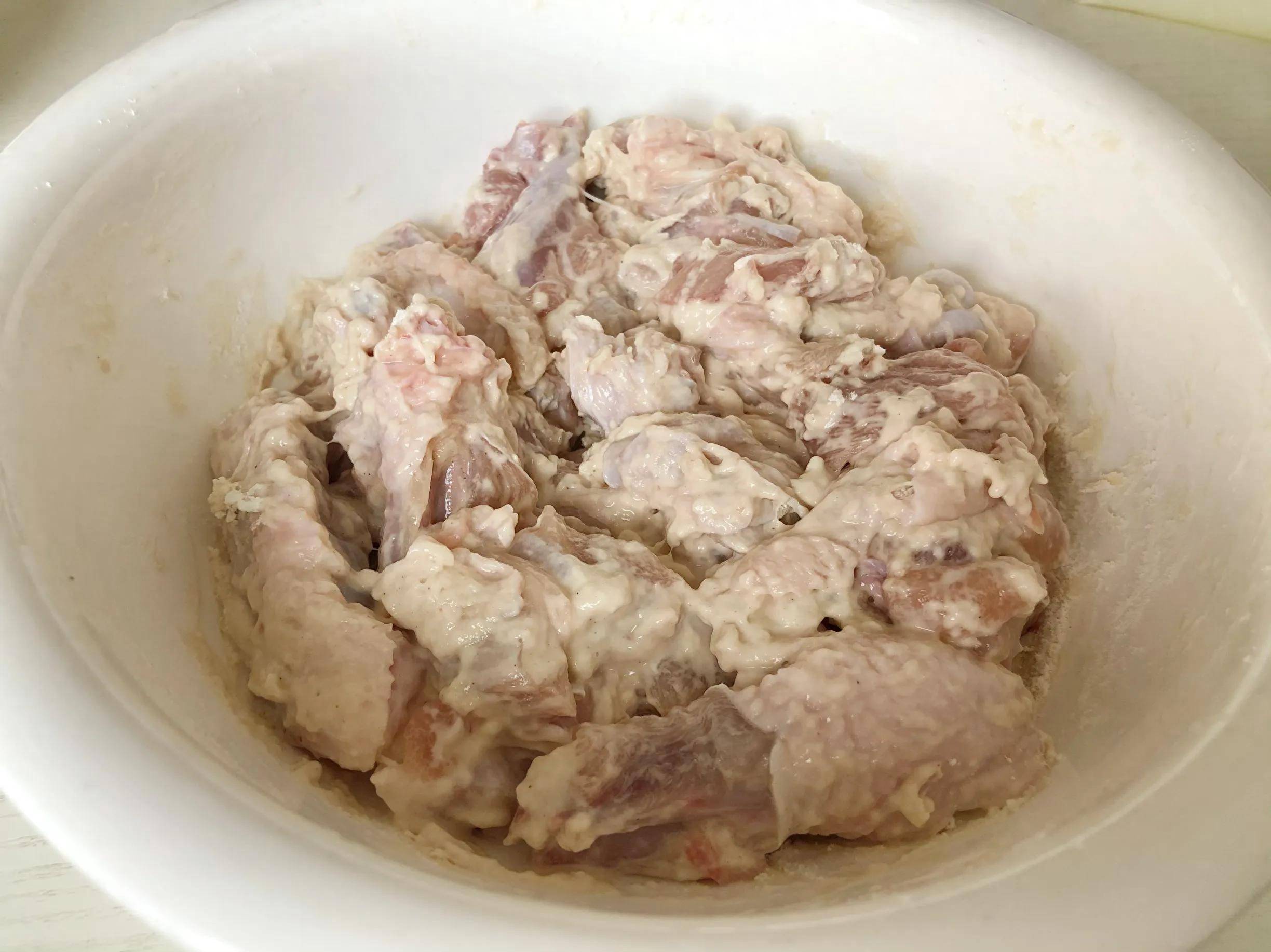 (3)腌制好的鸡块打入一个鸡蛋搅拌均匀,然后少量多次地倒入面粉,搅至每块鸡肉裹满面糊即可