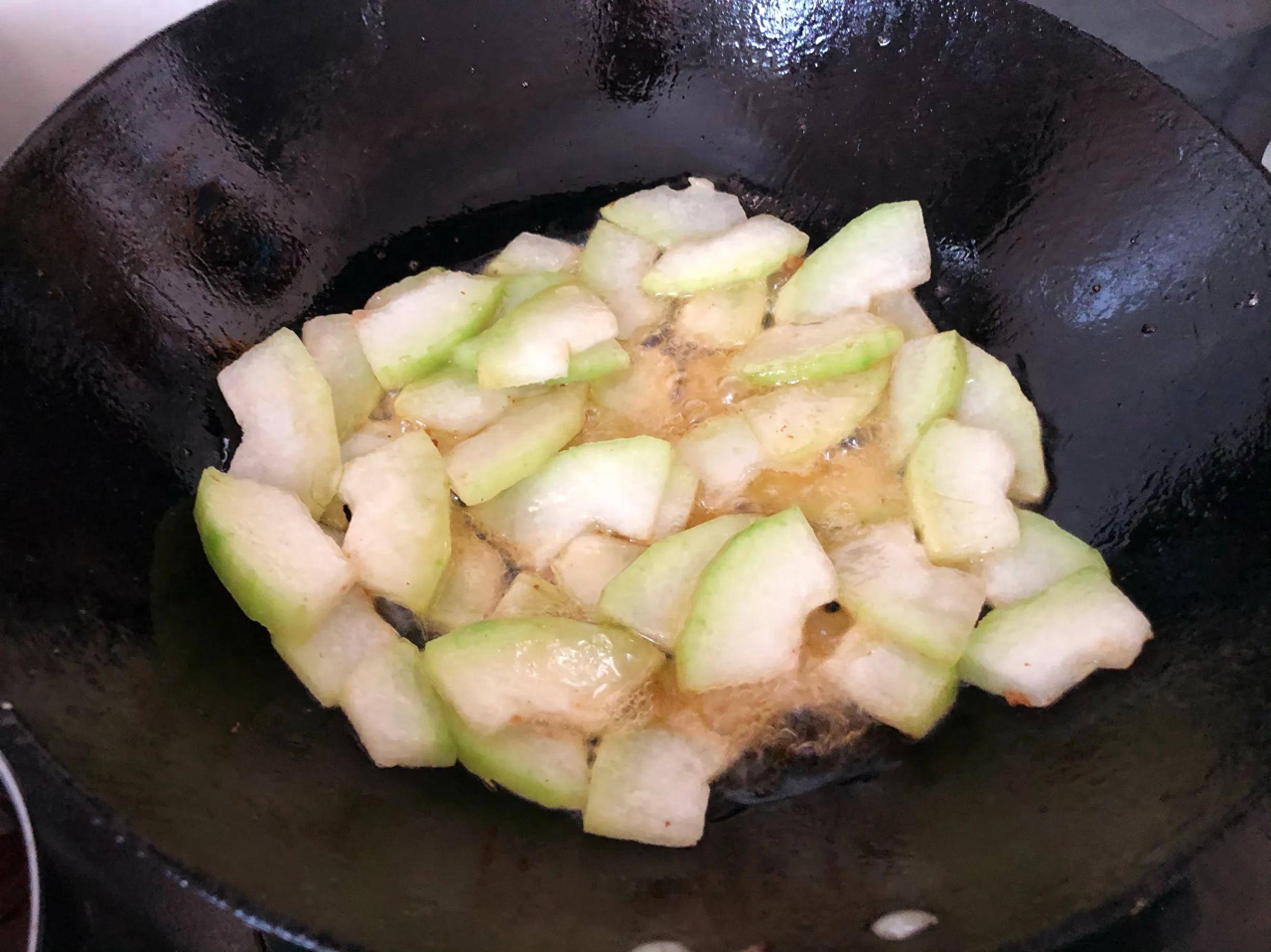 (5)锅里再次倒油,放葱姜蒜 八角 香叶 花椒 煸炒出香味儿,然后倒入冬瓜炒一下,接着多倒入一些开水 大火煮开