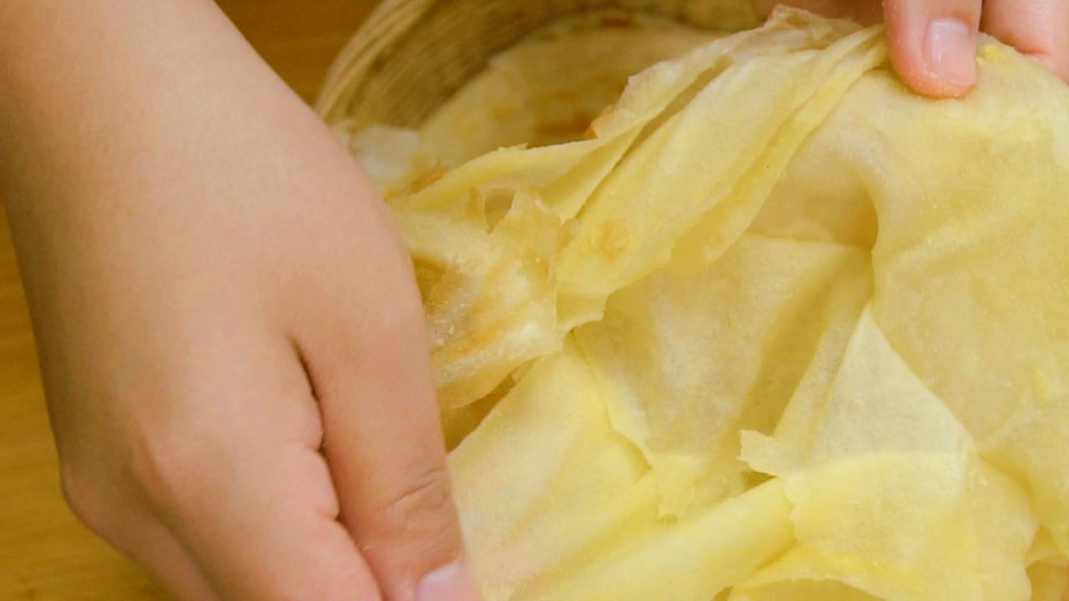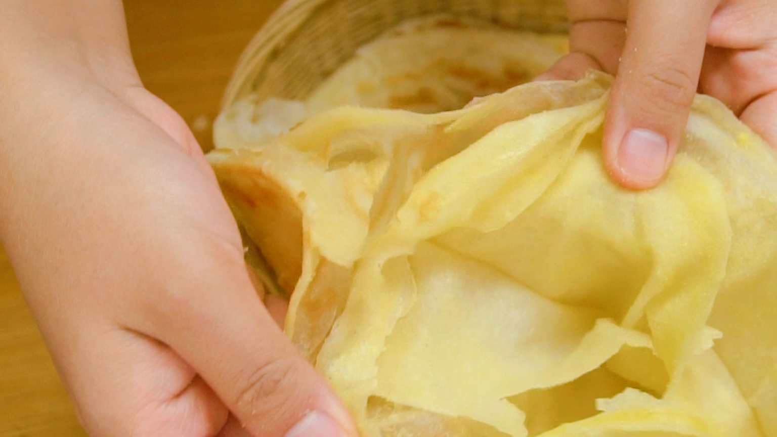 涂抹好之后,就到了有助于出层的另一个小妙招了。我们需要把饼皮分成8份,其中6份小的,两份大的。注意只切两边,中间不要切断,然后依次先把小的叠加起来,最后用大的面片包住包紧做收尾工作。