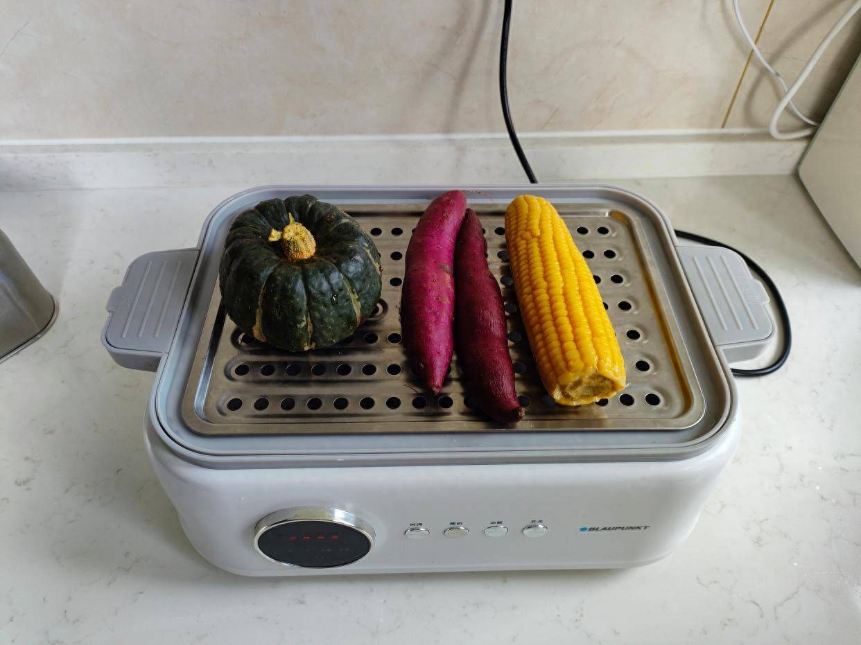 电蒸锅定时蒸半小时。其实,如果单独玉米只要15分钟就可以了,但是贝贝南瓜要半小时,所以多蒸一会儿也没事。