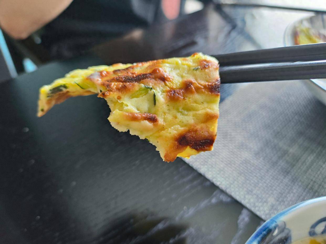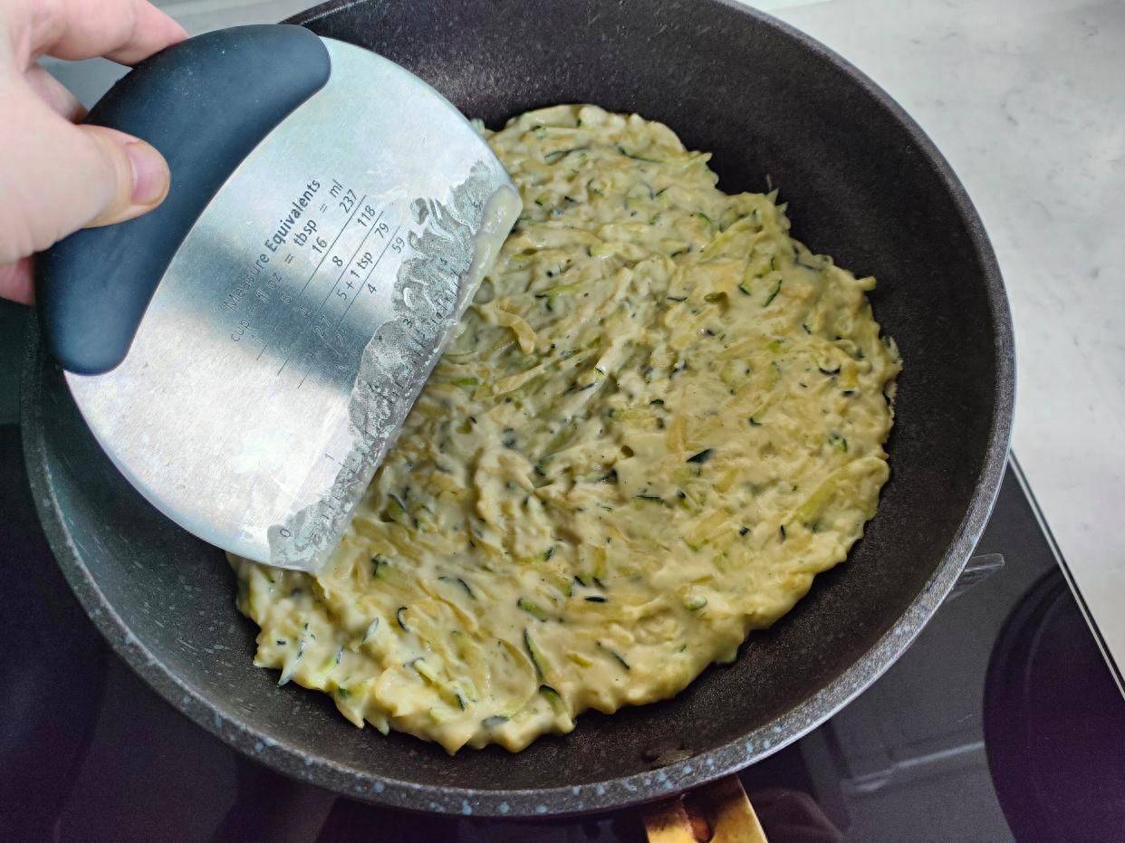 我用了一个不锈钢的切面刀,哈,没想到用来摊饼挺方便的。