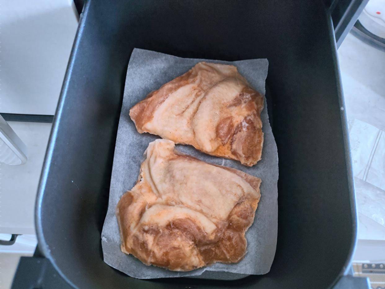 这个鸡腿扒是买的,平时冷冻在冰箱里,想吃的时候拿出来,也不用解冻,直接空气炸锅烤,或者平底锅煎就可以,已腌制好,不用任何调料,当早餐,真的很方便。