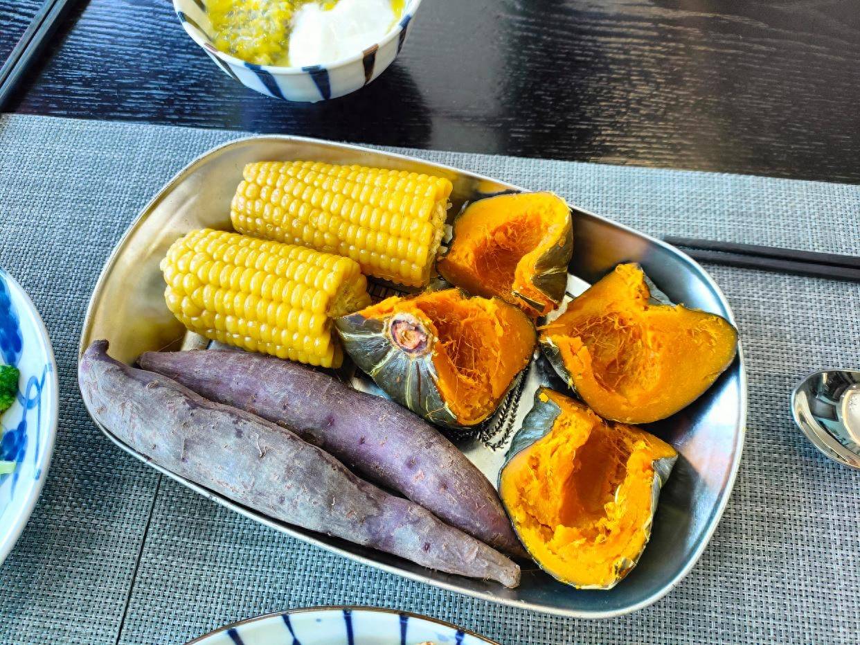 贝贝南瓜、内蒙古玉米、紫薯,一下蒸了3种。我这个人就是这样,喜新不厌旧,胃口不大,但是喜欢种类多一点,每样都尝一点,就像酒店的自助早餐一样,我的最爱,哈哈!