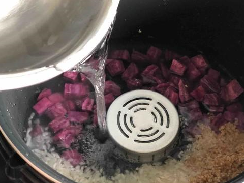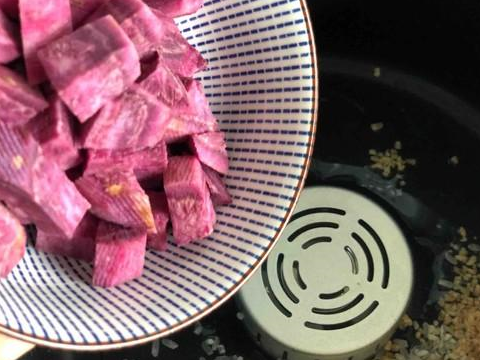 4.紫薯去皮切小块也倒入锅中