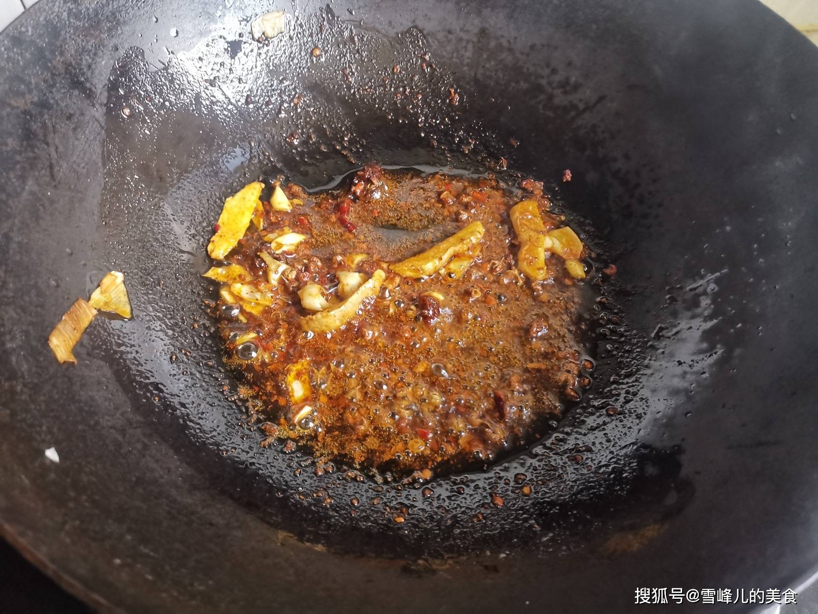 第四步:锅里放入花生油,放入葱姜爆香,放入麻辣底料炒匀,烹入少许料酒,生抽。